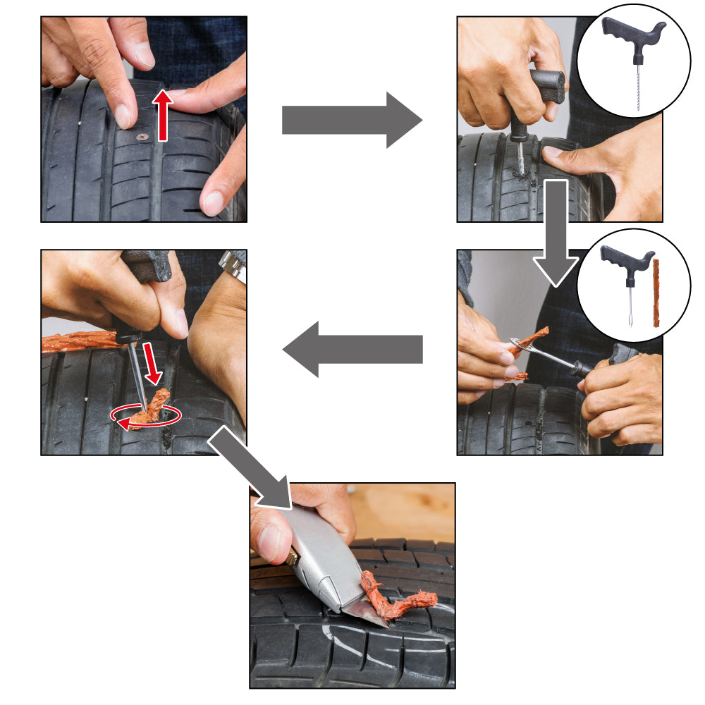 Vis ou clou dans une roue ? Roue crevée ? Besoin de réparer une roue ? À la recherche d'un kit de réparation ou d'une mèche pour roue ? Ce kit de réparation est fait pour vous.