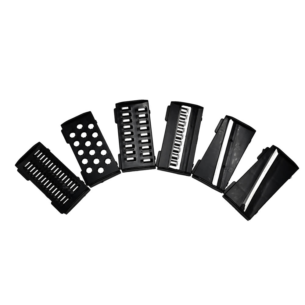 - 6 lames de découpe : 2 juliennes (3 et 5 mm), 2 tranches, 1 ondulée et 1 râpé.