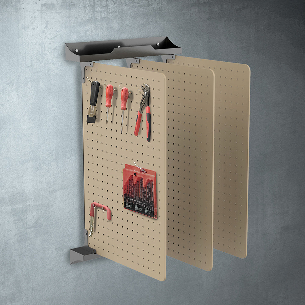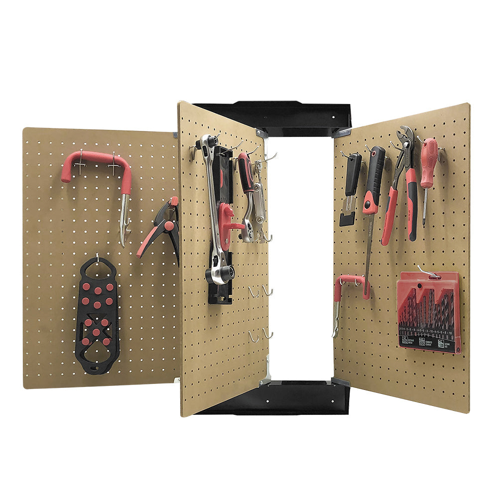 - Optez pour des panneaux muraux en MDF rabattables + 40 crochets inclus : ils ne prennent pas de place, vous disposez vos outils de chaque côté du panneau et vous organisez votre rangement comme cela vous convient.