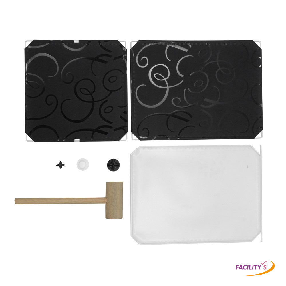 Tout le nécessaire de montage est inclus : 13 plaques rectangles pleines, 8 plaques carrées pleines, 4 plaques transparentes, 4 poignées, 16 crochets, 20 ronds plastiques, 4 attaches portes et 1 maillet.