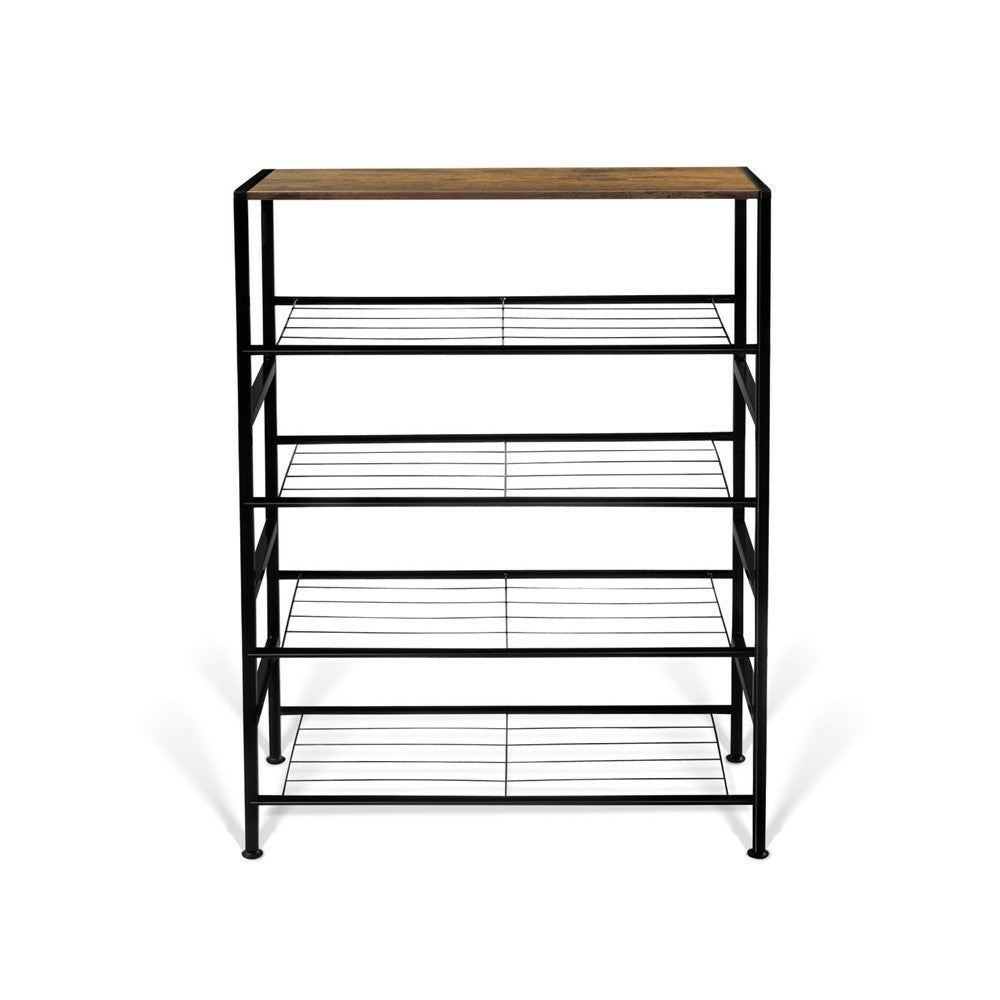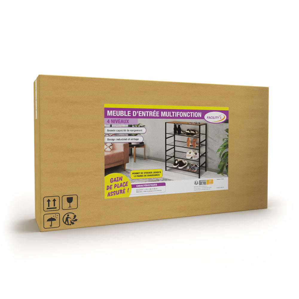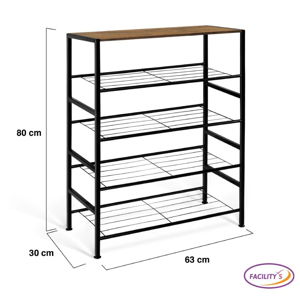 - Très pratique, cette étagère à chaussures comporte un plateau en bois et 4 rayons en métal pour ranger toutes les affaires du foyer.