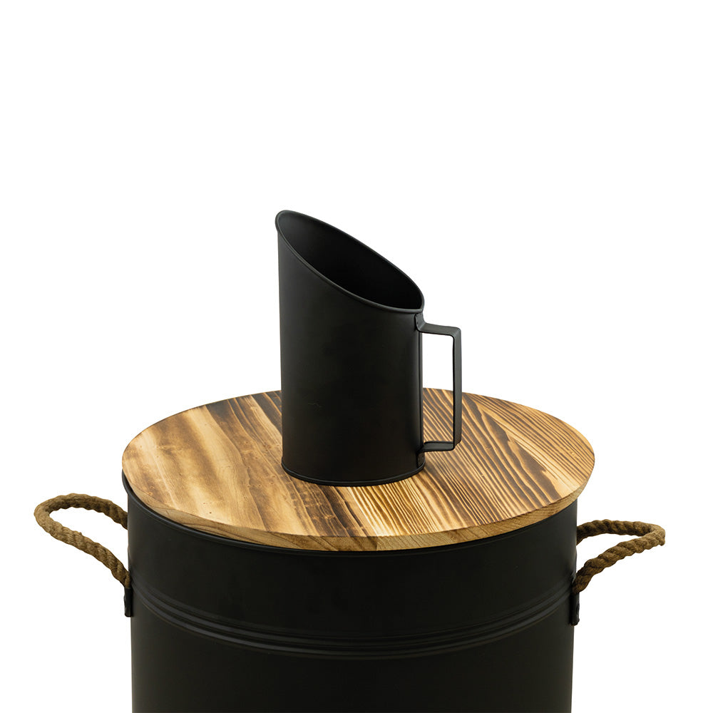 Pelle à granulés en métal noir dotée d’un fond perforé pour filtrer la poussière lors du remplissage. Pratique, compacte et robuste, elle facilite le quotidien autour du poêle.