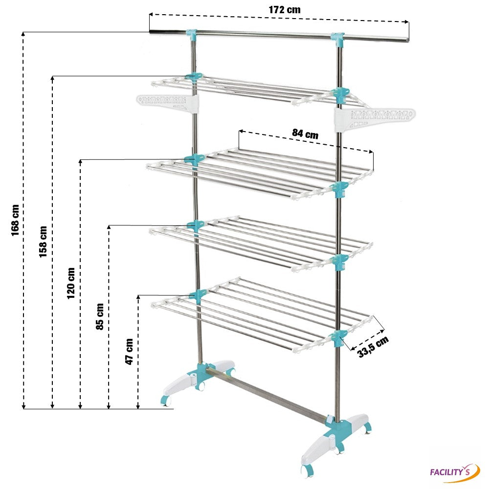 - 1 grande barre télescopique, 2 porte-cintres, 48 crochets pour lingerie, 8 plateaux d’étendage… Vous disposez de 30 m d’étendage pour l’entretien de votre linge !
