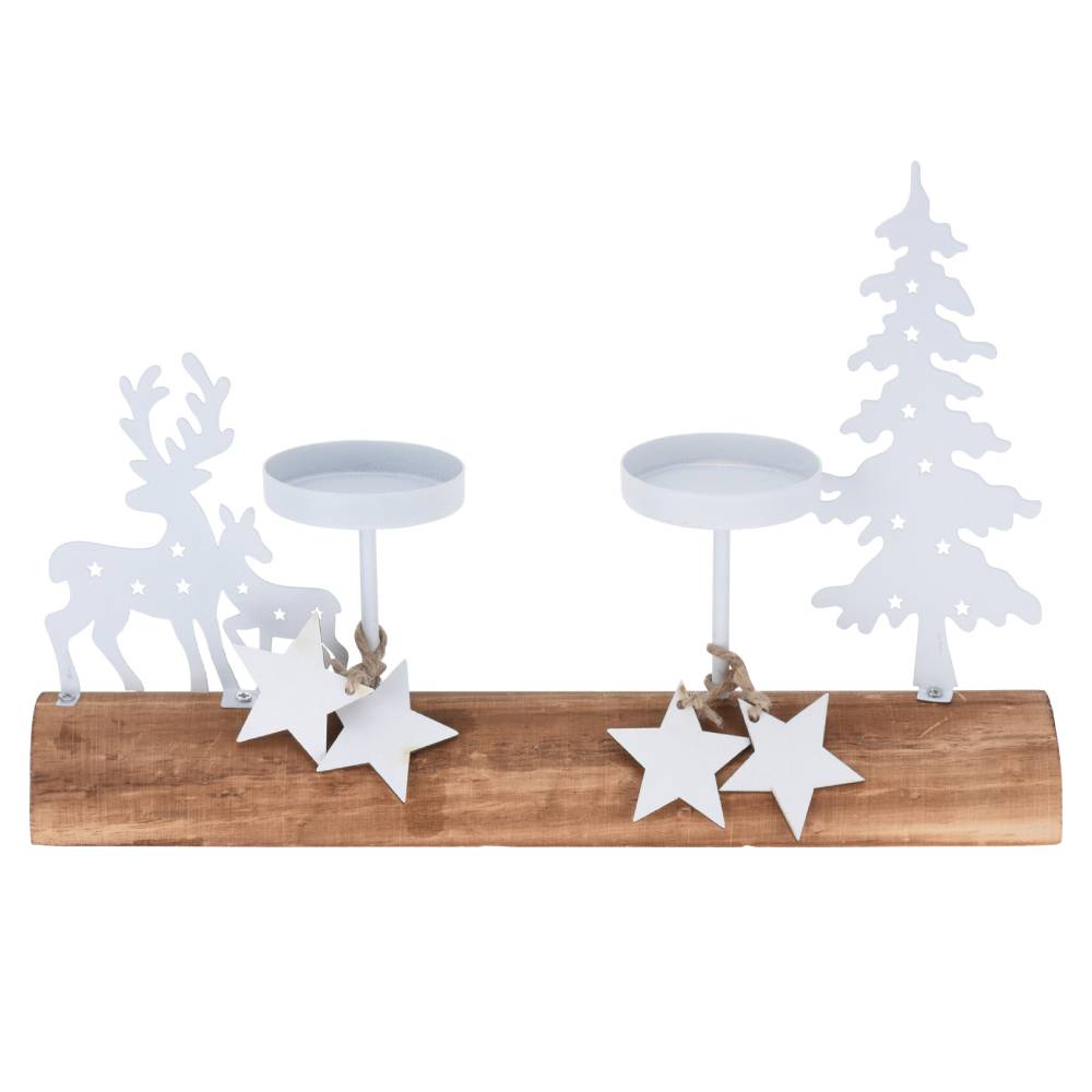 • Centre de table en bois avec 2 réceptacles à bougies et motifs de Noël : rennes, sapin et étoiles.