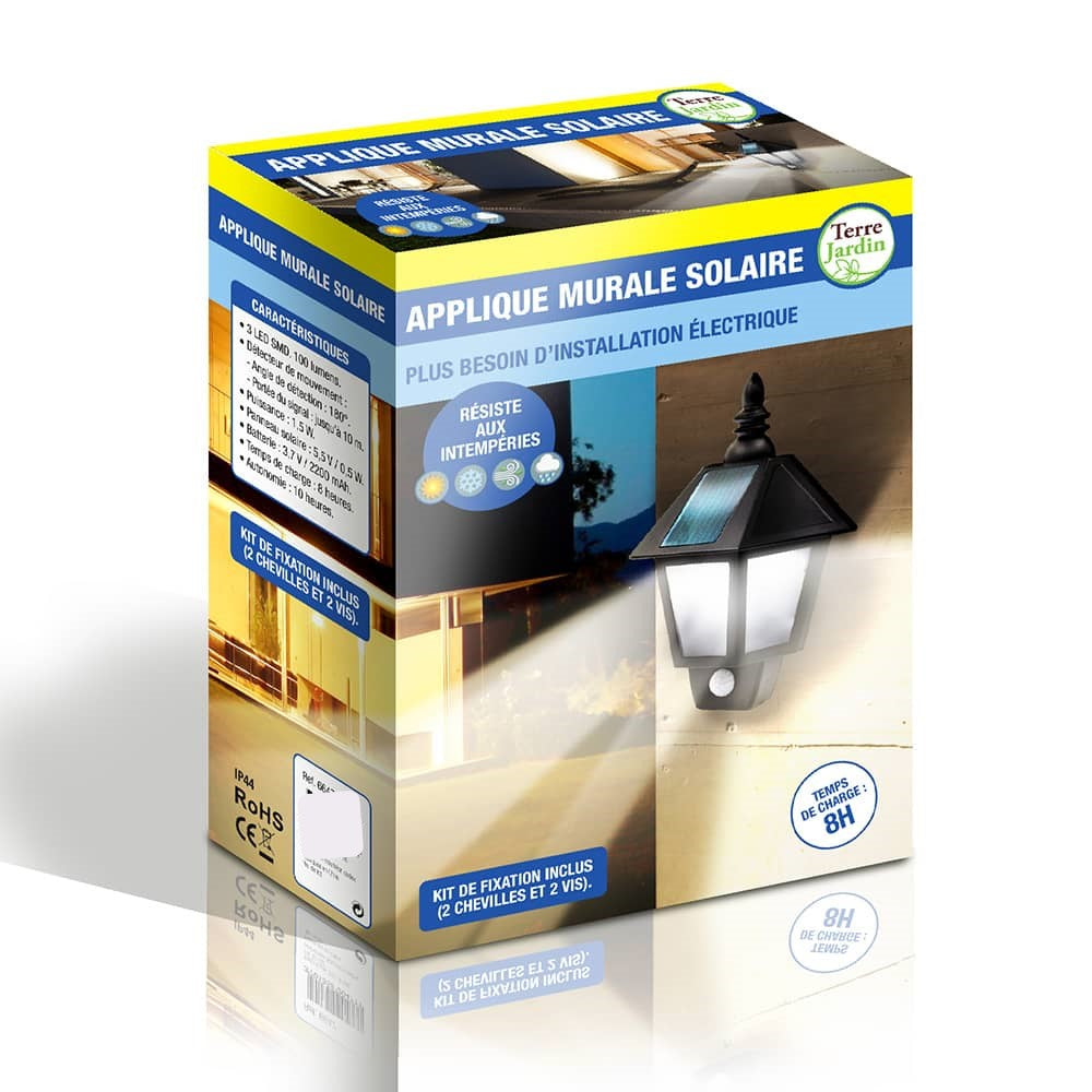 - Aucune installation électrique n'est nécessaire : fonctionne à l'énergie solaire grâce à un panneau situé sur le haut de l'applique qui rechargera sa batterie de 3.7 V, 2200 mAh.