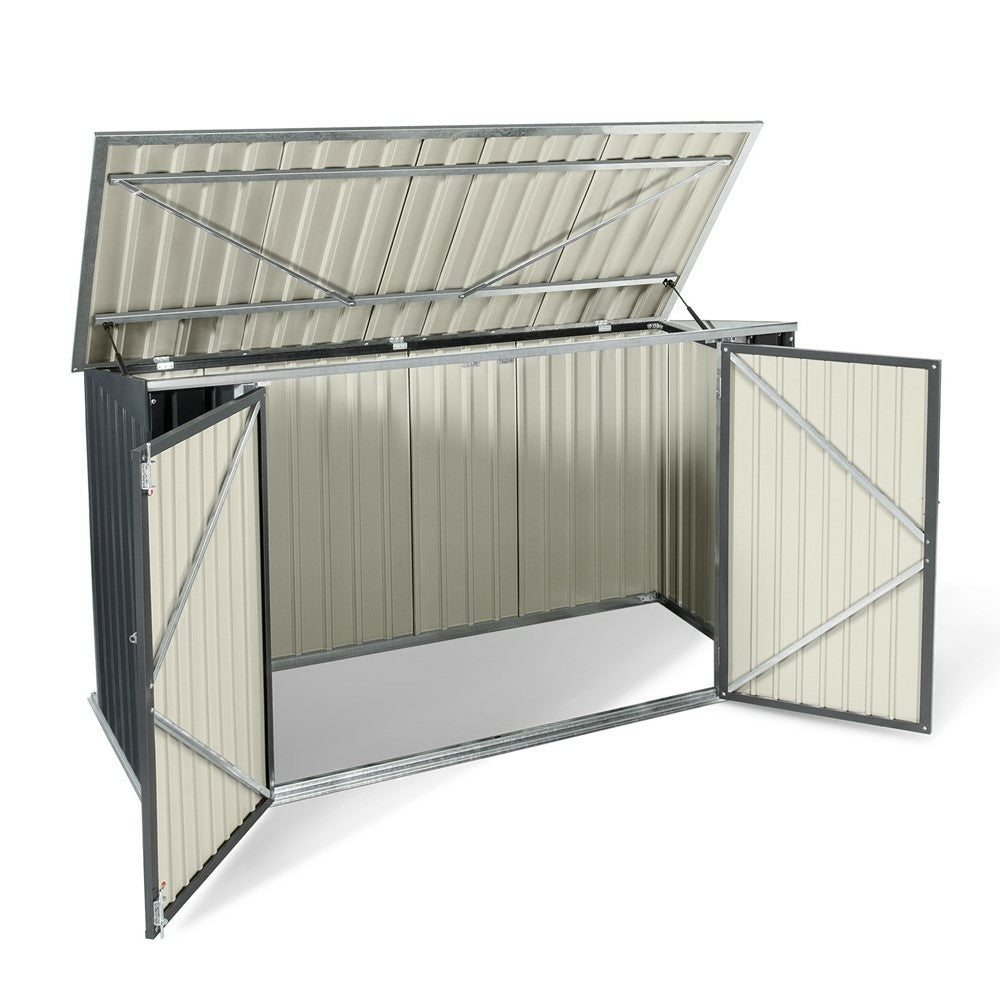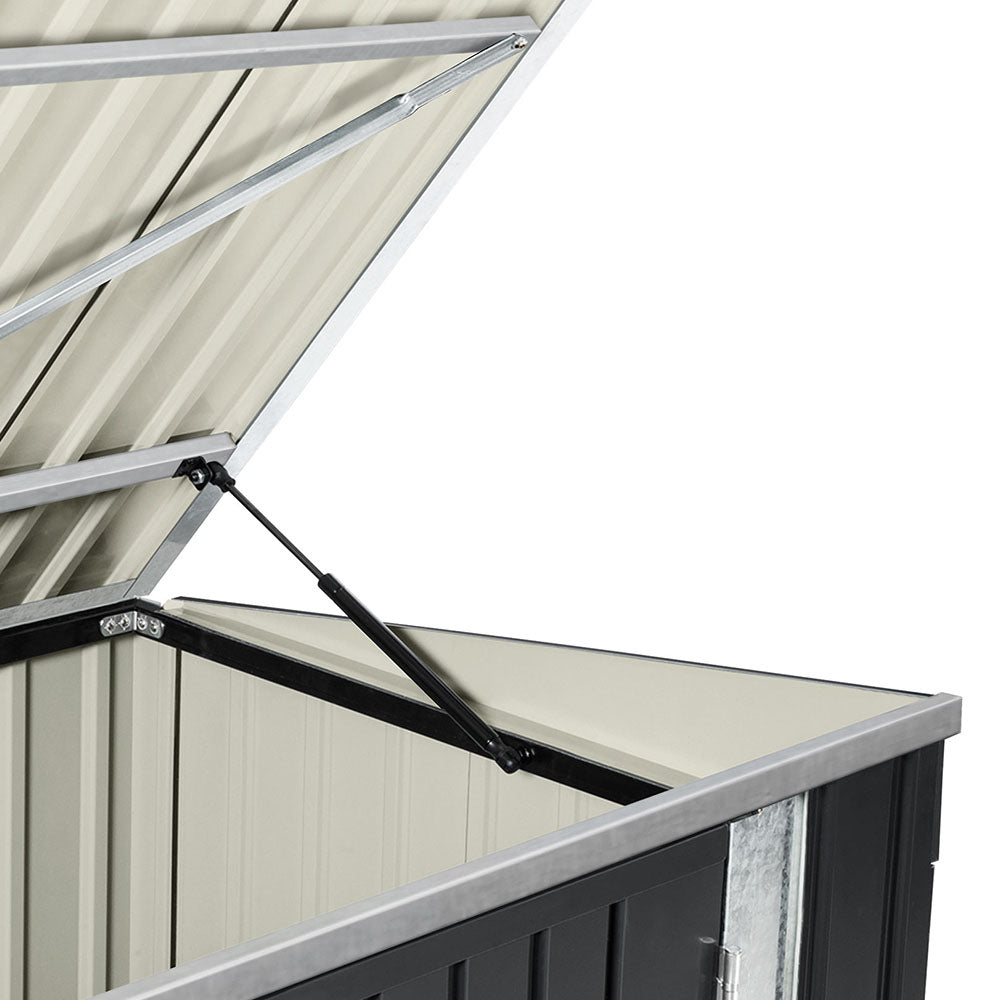 - Design pratique et esthétique : coloris gris foncé moderne, parfait pour un abri de jardin, ce grand coffre de rangement est doté d'un toit ouvrant par système de vérins à gaz et d'une double porte avec loquet de fermeture.