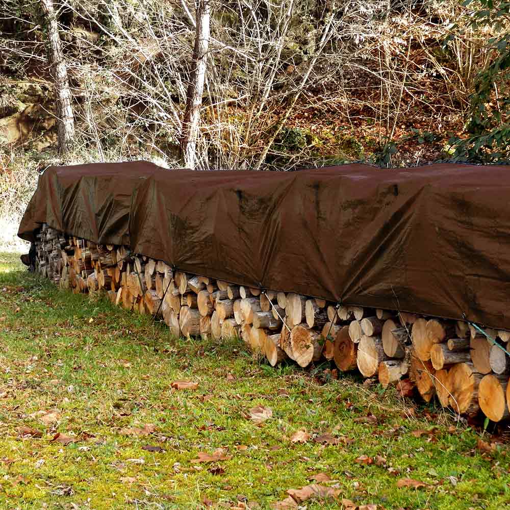 - Bâche à bûches nature de 140g/m2 en polyéthylène. Pratique, elle est munie d’œillets tous les 50 cm pour sa fixation et sa discrète couleur marron se fond parfaitement dans le paysage.