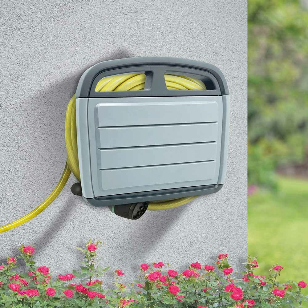 - Livré avec sa fixation, le range tuyau mural comporte un coffre de rangement avec étagère intégrée pour tout avoir à portée de main et à l'abri des intempéries.