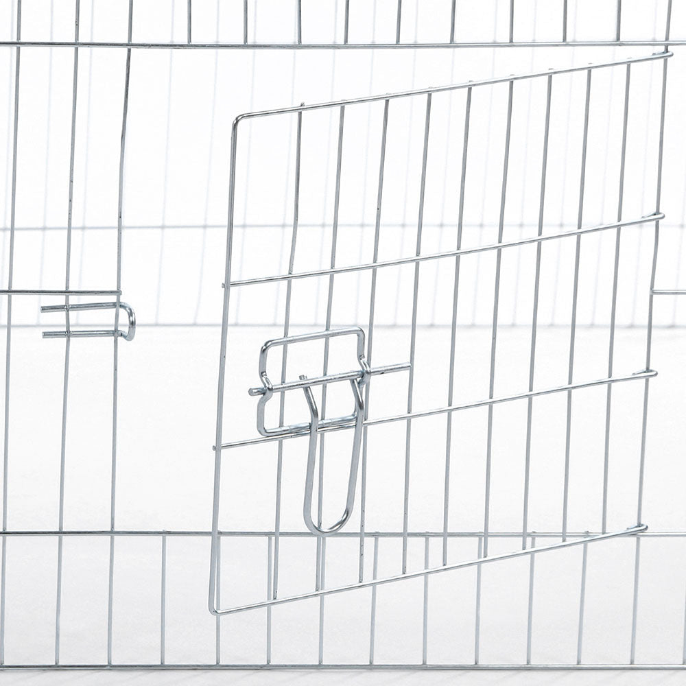 - Dimensions de l'enclos pour animaux : longueur 180 x largeur 75 x hauteur 75 cm. Toile d'ombrage amovible : longueur 88 x largeur 58.5 cm. Portes latérales : longueur 29.5 x hauteur 27.5 cm. Grillage en acier zingué.