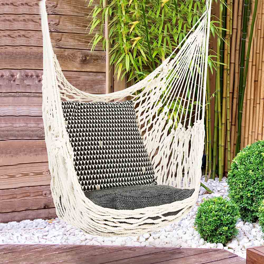 - Robuste hamac filet en corde tressée, ce fauteuil suspendu en macramé sera du plus bel effet sous votre véranda ou sur votre balcon.