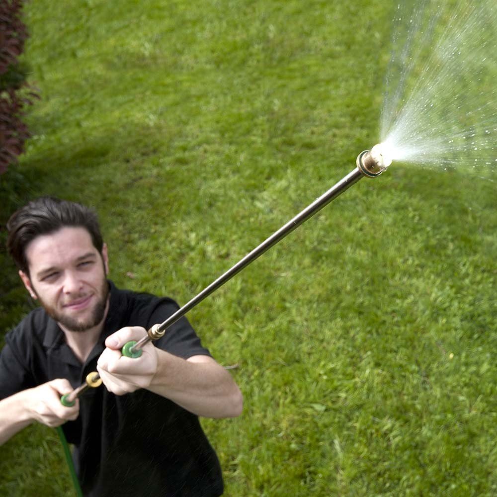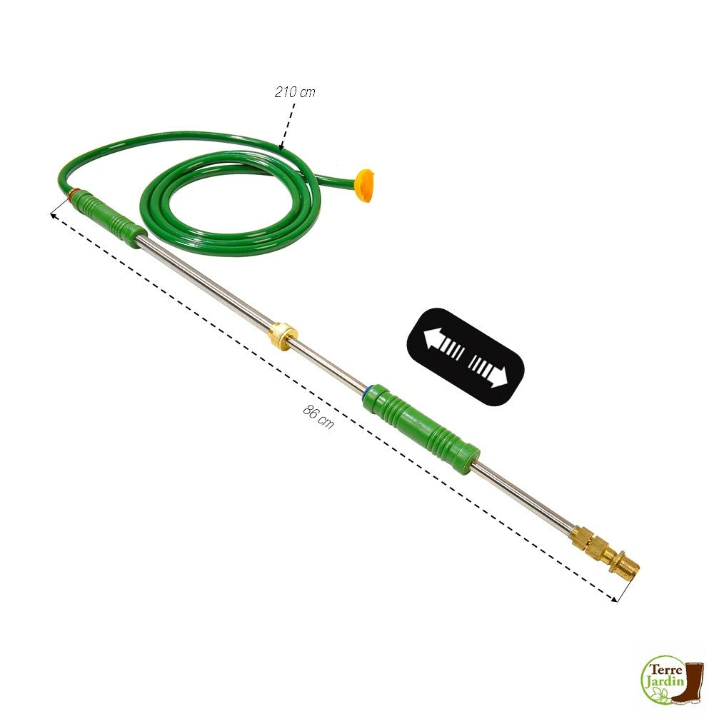 - La lance longue de 86 cm et son tuyau de 210 cm peut arroser les coins les plus éloignés.