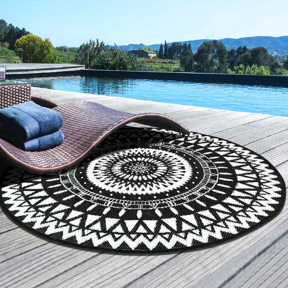 - Ne choisissez plus entre le confort et l’esthétisme : craquez pour ce magnifique tapis outdoor design noir et blanc de diamètre 150 cm !